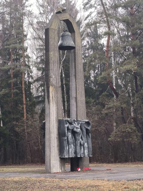 Открывает мемориал расколотая бетонная плита – порог жизни и смерти. Напротив, на противоположной стороне размещены 3 валуна, символизирующих три тысячи расстрелянных здесь людей. Валуны разных размеров, что обозначает людей разного возраста, как символ трех поколений, погибших на этом месте. Центральный памятник представляет собой арку, образованную двумя 12-метровыми железобетонными опорами, очертания которых повторяют формы столбов, ограждавших нацистские концлагеря. К опорам на цепях подвешены два колокола. Символические опоры, образующие арку, в нижней части обведены кубом из кованой меди. На нем – горельефы, изображающие людские руки. Эти руки словно поднялись из могил, пронзив толщу земли. От памятника в глубь леса ведут две бетонированные дорожки. Они приводят к двум ямам-могилам и символическому эшафоту-стене. Стена состоит из 3 000 камней, по числу жертв.